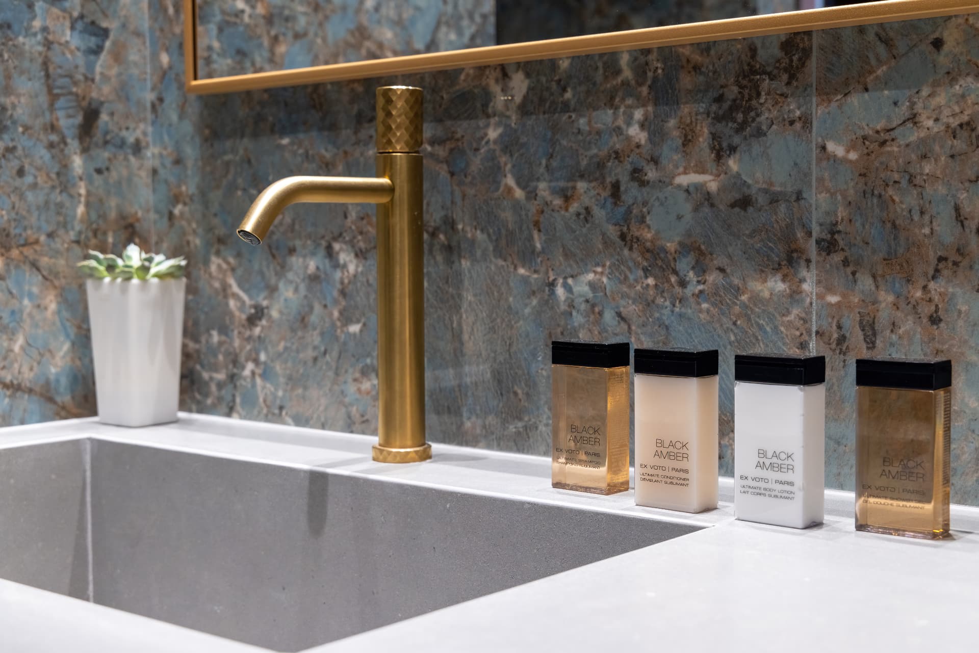 Προσεκτικά διαλεγμένα έπιπλα Rugiano, ιταλικό μάρμαρο και μια εκλεπτυσμένη χρωματική παλέτα,